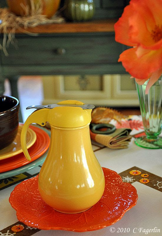 Vintage Yellow Fiesta Syrup Pitcher sitting on a vintage Kraft Foods promotional leaf plate.
